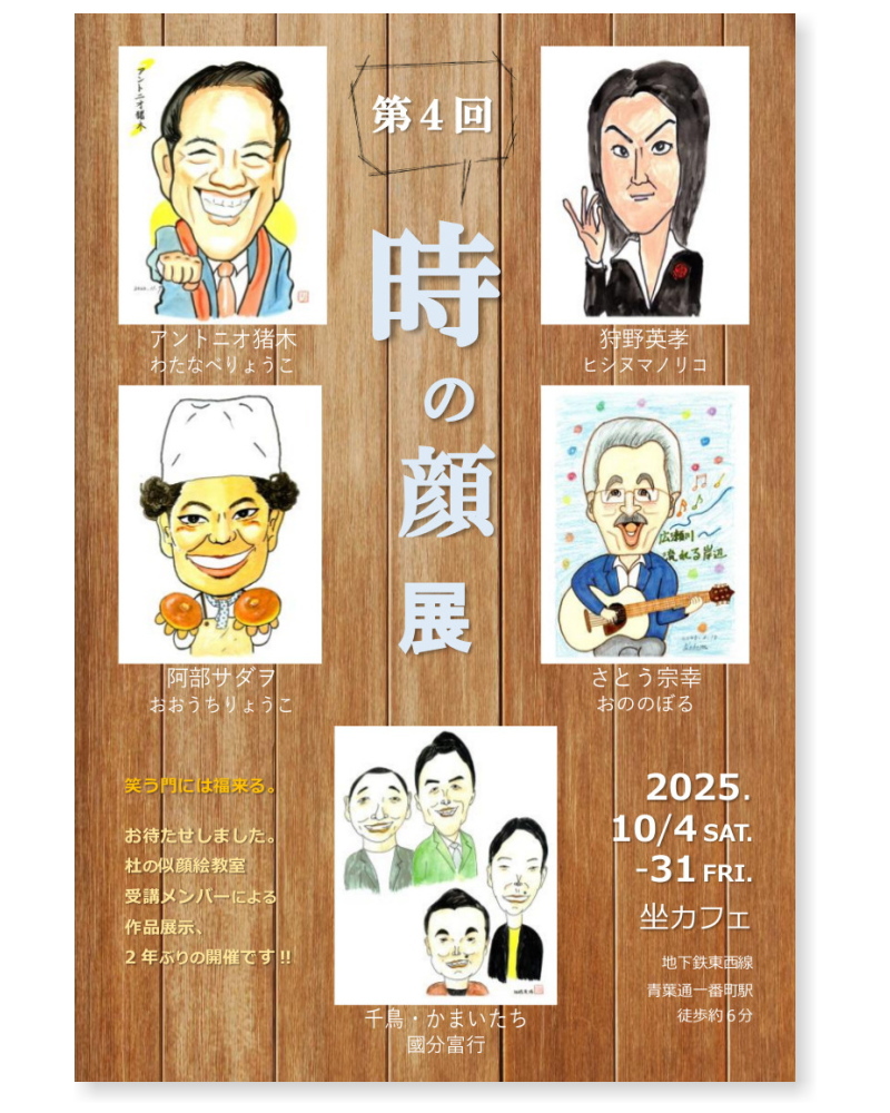坐カフェ(青葉区大町)にて、似顔絵教室作品展「第4回 時の顔展」がスタート。31日まで。